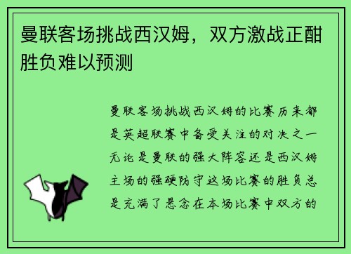 曼联客场挑战西汉姆,双方激战正酣胜负难以预测
